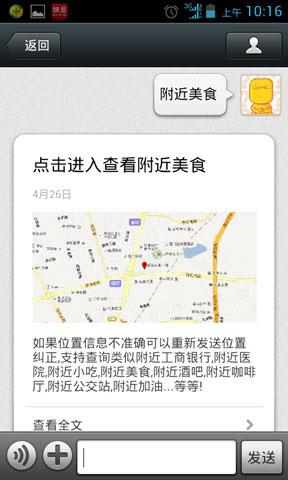开启此功能,首先要发送地理位置信息,然后输入附近+关键词即可,例如 附近酒吧,附近学校,附近工商银行,附近医院,附近小吃,附近美食,附近酒吧,附近咖啡厅,附近公交站,附近加油站.......