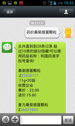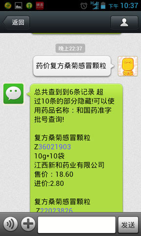 例如:药价 Z11021209 或者 药价 桑菊感冒颗粒
