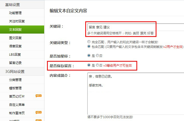 开启此功能,只需要设置好关键词,选择包含匹配,选保存留言,当粉丝发送的信息有包含你设置的关键词就可以在后台查看到。