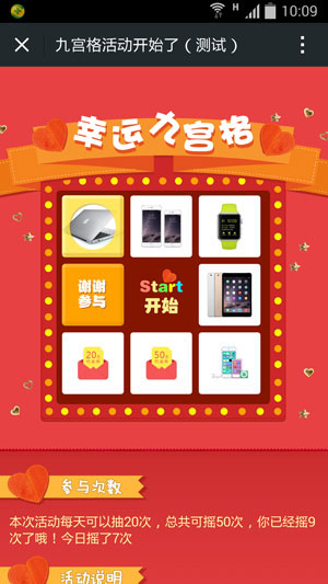 功能亮点:手机九宫格活动,让你犹如回到童年,简单直接的抽奖方式,用户参与简单,娱乐度高。